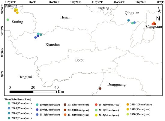 The monitoring results showed that various degrees of uneven land subsidence occurred in Cangzhou between 2004 and 2020. In the past 16 years, Suning and Xian counties in the western part of Cangzhou and Dongguang County in the south of Cangzhou have been experiencing serious subsidence. The subsidence rate of Suning County increased from 54 mm/year in 2004 to 88 mm/year in 2020. The subsidence rate of Xian County increased from 60 mm/year in 2004 to 75 mm/year in 2020. Similarly, that of Dongguang County increased from 52 mm/year to 64 mm/year. On the other hand, Qing County’s subsidence showed a trend of decreasing year by year over the 16 years, decreasing from 48 mm/year in 2004 to 23 mm/year in 2020.