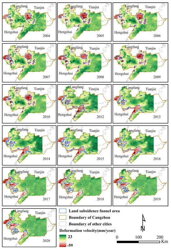 Temporal distribution map of interannual variation in land subsidence funnels in Cangzhou from 2004 to 2020.