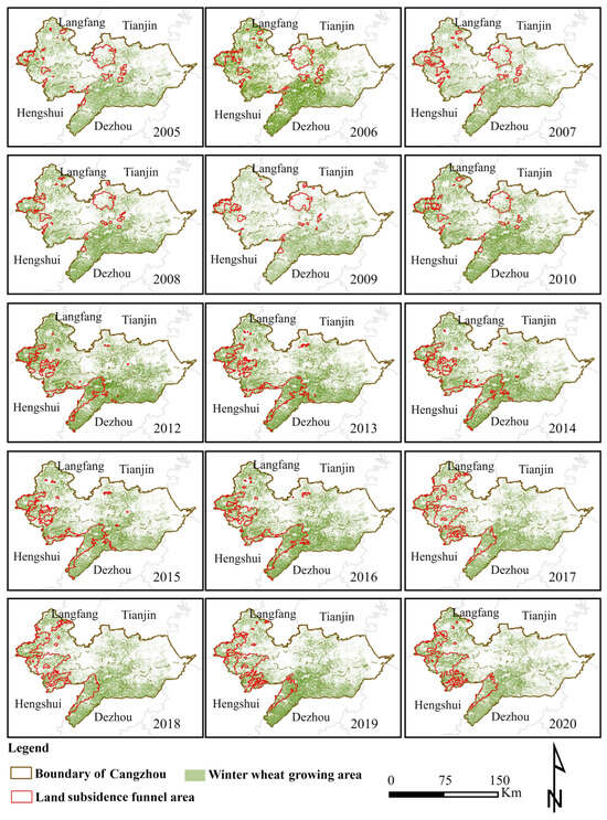 - From 2004 to 2020, the area of land subsidence funnel in Cangzhou showed a trend of first increasing and then decreasing, among which, the area of the subsidence funnel reached the maximum in 2012, which was 7.6 × 103 km2. The planting distribution of winter wheat in the subsidence funnel area experienced a trend of first decreasing, expanding, then flattening and stabilizing year by year. In 2012, the proportion of winter wheat in the funnel area was the highest at 97%.