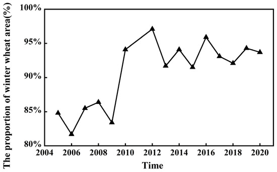 From 2005 to 2020, the distribution of winter wheat in Cangzhou underwent two main stages. The first stage was characterized by an initial decrease followed by expansion from 2005 to 2012. The second stage, from 2012 to 2020, was marked by a continuous annual decrease. In 2007, the planting area of winter wheat in Cangzhou reached its lowest point at 344 × 103 hm2, possibly due to the national drought disaster that occurred that year [47]. From 2013 to 2020, the planting area of winter wheat in Cangzhou continuously declined due to the proposed adjustment to the agricultural planting structure [48]. This adjustment led to changes in the sown varieties and conditions of winter wheat. In 2020, the planting area of winter wheat in Cangzhou was at least 334 × 103 hm2, a decrease of 30 × 103 hm2.