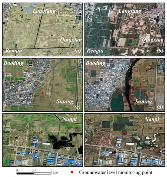 In order to further analyze the spatio-temporal response process of land subsidence, winter wheat planting distribution, and groundwater levels in Cangzhou, we identified the soil utilization types of monitoring well locations, as shown in Figure 9. In light of the limited monitoring well data, the wells in the urban areas surrounding the Cangzhou sedimentation funnel were selected as a reference. As can be seen from Table 5, the land use types of the three water level monitoring wells were similar. They are all located in the farmland area, with a large number of densely populated rural residential lands surrounding them. The maximum subsidence of the three wells was 112, 96, and 79 mm/year, respectively.