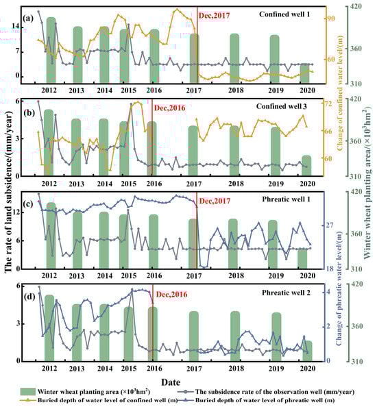 Overlay of results of confined wells and phreatic wells with winter wheat planting area and subsidence rate. (Well 1 includes monitoring of confined water and phreatic water levels. Well 2 is a phreatic well, and Well 3 is a confined water well). ((a) is well 1 in Figure 9, (b) is well 3, (c) is well 1, (d) is well 2).