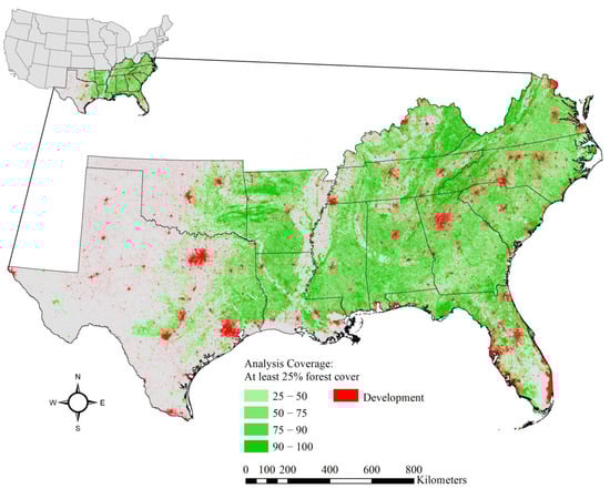 The study area included 13 states in the southeastern United States (USDA Forest Service Region 8). Landscapes with at least 25% forest cover were included in the analysis.