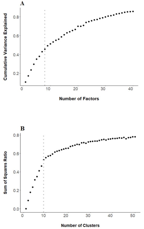 Plots for determining the number of factors and clusters. (A) Cumulative variance explained to identify a shelf or elbow relative to the number of factors included in the factor analysis. While the plot indicated a relatively smooth curve, a choice of 8 factors resulted in readily interpreted factor loadings. (B) Sum of square ratios used to identify a shelf or elbow relative to the number of clusters included in the cluster analysis (occurs at 9 clusters).