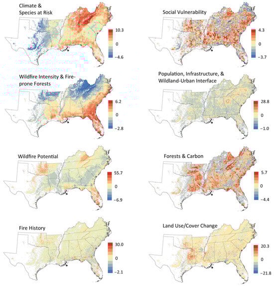 Finally, factors 5 and 8 quantified important forest characteristics and aspects of land cover. We named factor 5 Forests and Carbon. Nine variables had loadings >0.30 for this factor. High values were associated with high proportions of forest cover and natural cover, low proportions of agricultural cover and WUI, and high forest carbon stocks, forest fuel load, forest at risk from insects and disease, and high-priority conservation areas. Landscapes with high values were concentrated in places with extensive forest cover throughout the region. We named factor 8 Land Use/Cover Change. Three variables had loadings >0.30 for this factor, all quantifying change in the proportion of natural or agricultural land. Landscapes with high values were characterized by increasing natural land cover and decreasing agricultural cover—mainly reflecting conversion from agriculture to a variety of land uses in the generalized ‘natural’ cover class [71,72]. Landscapes with positive values were widespread and most frequently in the western part of the region (e.g., east Texas) and along the Atlantic coastal plain. Areas with negative values, indicating natural cover loss, were also widespread, but interior highland landscapes mostly showed values near zero for this factor.