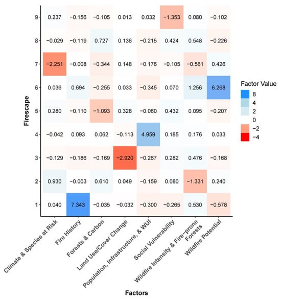 Heat map characterizing firescape classes (y-axis) in terms of their centroid values for the factor variables (x-axis) subjected to cluster analysis.