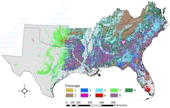 We did not include parameters for spatial location or adjacency in the cluster analysis, treating individual landscape units as though they were spatially independent. The clear spatial contiguity of landscapes in a given firescape (Figure 5) resulted instead from autocorrelation in the input data describing landscape properties—a typical characteristic of spatial data. Although a spatial clustering routine could be applied if stronger contiguity of firescapes were desired, advantages of not doing so are twofold. First, a preference for spatial proximity can force landscapes into a class other than what would be assigned if only the social and ecological properties of principal concern are considered. Second, when spatial proximity is not a parameter, landscapes with similar properties but separated by large distances can easily fall within the same firescape class. This is clear in our spatial results, with disjunct pockets of a given firescape occurring across the region. For example, firescape 6 (Rural mixed forest with hazardous fire potential) had two widely separated centers of abundance, in Florida and Oklahoma, and even within each of those areas the distribution of this firescape was fragmented. This example also illustrates that landscapes as clearly dissimilar as those in eastern Oklahoma and central Florida can nonetheless share properties that are important for determining how fire operates, and affects people, in those places.