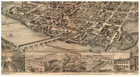 Figure 2 is an 1884 commercially produced bird’s-eye view of Lewisburg presenting a capitalistic ideology of the growing town near its industrial peak [24]. The image celebrates the industrial activities at the waterfront, showing an armored shoreline, bulky factory buildings and warehouses, hectares of materials yards, and hypertrophic billowing smokestacks. Few residential buildings are visible near the river at that time. Now no industry remains in the area covered by this image.