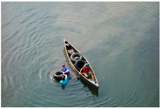 The verbal construction of the towns in their tourist literature and their public activities has brought the river into the center of community identity, with river festivals and annotated history walks proliferating, for example. Sunbury has a River Festival each August and Catawissa, 18 km up the North Branch, has an annual Watershed Festival. Towns take symbolic possession of adjacent parts of the river with clean-ups, getting residents to personally invest in the riverscape. Figure 4 shows residents pulling old tires from the bed of the West Branch at Lewisburg. The town worked to reclaim a sense of the Susquehanna as a clean stream and to facilitate an emotional investment in the water’s quality by addressing a decades-long legacy of dumping.
