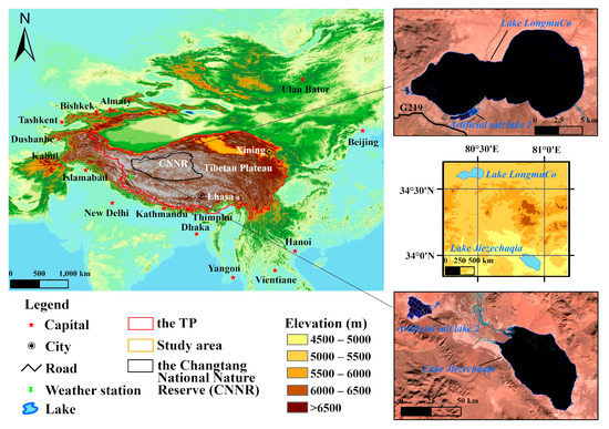 Lake LongmuCo (80°27.41′ E, 34°36.85′ N, 5005 m a.s.l.) and Lake Jiezechaqia (80°54.14′ E, 33°57.26′ N, 4527 m a.s.l.) are glacier-fed lakes [10]. They are located on the western edge of the CNNR [47,48] (Figure 1). Calculated from Landsat images, the average areas of Lake LongmuCo and Lake Jiezechaqia were 106.80 km2 and 114.98 km2 in the period of 1972–2021, respectively. The nearest road to Lake LongmuCo is National Highway No. 219 (Figure 1).