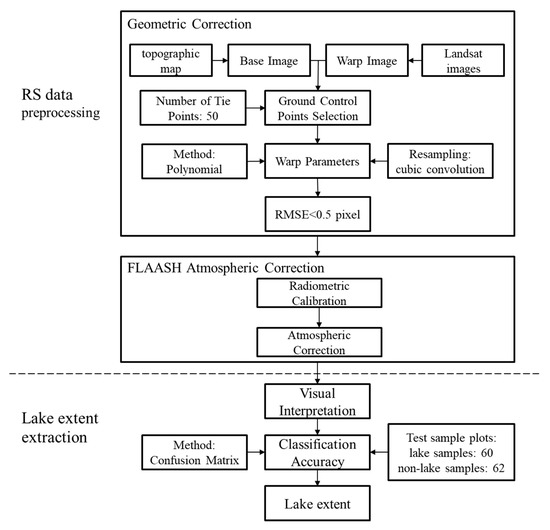 Using ENVI 5.3 software, the data preprocessing (Figure 2) of Landsat satellite images was divided into two steps: (1) geometric correction and (2) radiometric calibration and atmospheric correction. In Step (1), the value of root mean square error (RMSE) of each image was less than 0.5 pixels.