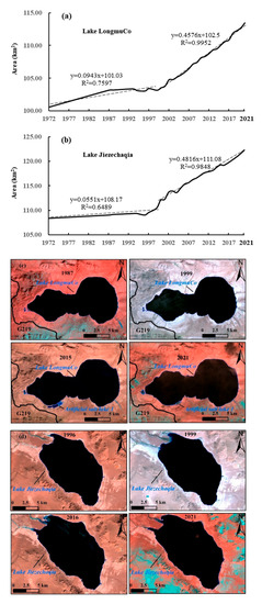 After the steps mentioned above, 30 Landsat satellite images were used for the extraction of the extent of lakes. Then, we used the method of visual interpretation to delineate the selected lakes and non-lake land covers between 1972 and 2021 (Figure 2). Accuracy of lake extent was assessed by using the method of Confusion Matrix [55]. In this study, the overall accuracy of Lake LongmuCo and Lake Jiezechaqia extents in 2021 were 99.30% and 99.09%, k = 0.9826 and 0.9789; producer accuracies were 99.44% and 100.00%; and user accuracies were 98.01% and 97.21%, respectively.