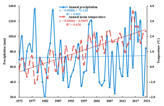 Changes in the annual mean temperature and annual precipitation around the study area during 1972–2021.