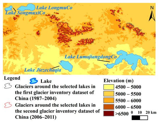 In this study, the glacier data were obtained from the first glacier inventory dataset of China (1987–2004) and the second glacier inventory dataset of China (2006–2011) [52]. Among these data, we analyzed the glacier area changes around the regions of Lake LongmuCo and Lake Jiezechaqia by comparison between the two glacier inventory datasets mentioned above.