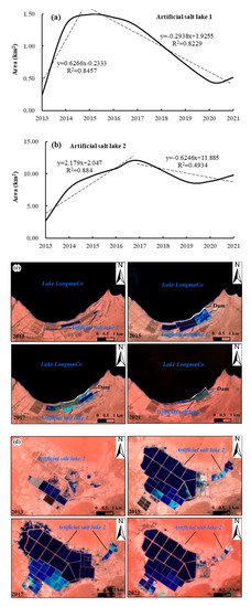 More specifically, Figure 6 illustrated the changes in Lake LongmuCo and Lake Jiezechaqia exposed to the exploitation of lithium resources. Since 2013, one state-owned enterprise engaging in Lake LongmuCo exploitation has settled in and built dams to shift the water from Lake LongmuCo to an artificial salt lake (Figure 6). From 2013 to 2021, the average area of the Artificial Salt Lake 1 constructed by the state-owned enterprise was 0.88 km2. The area of this artificial salt lake was 0.24 km2 in 2013 and rose to 0.51 km2 in 2021 (Table S1), and the maximum area of it occurred in 2015 (1.49 km2). Figure 6 shows that the changes in the Artificial Salt Lake 1 can be divided into two periods: (1) a rapid expansion from 2013 to 2015; (2) a decrease from 2016 to 2021. During 2013–2015, the area of Artificial Salt Lake 1 increased, with a β (%) of 174.96%/a (r = 0.928, p = 0.011 < 0.05). During 2016–2021, the area of Artificial Salt Lake 1 decreased, with a β (%) of −9.36%/a (r = −0.973, p = 0.003 < 0.01).