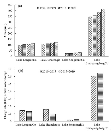 Comparison of area (a) and water storage (b) changes of Lake LongmuCo, Lake Jiezechaqia, Lake SongmuxiCo, and Lake LumajiangdongCo.