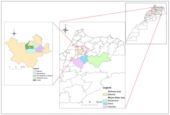 In Morocco, the agroecology is gaining interest among decision makers as a possible answer to the challenges that agricultural systems are facing [15,16,17]. Therefore, this paper investigates three aspects in relation to agricultural systems and agroecology basis on two study sites, Moulay Driss Zerhoun and the Middle Atlas, located in the Northern and Southern limits of the Saiss plain, respectively. First, this study aimed to characterize farmers and describe the agricultural systems in the selected sites. Second, we sought to analyze the relationship between agricultural practices and crop types among participating farmers. Third, we analyzed the local agricultural production system regarding the agroecology basis. The study zones were selected in the Saiss agricultural plain, considered one of the most fertile and productive regions in Morocco. Additionally, this plain is dominated by small farms [18]. Therefore, this area is of great importance in analysing the relationship between agricultural practices and agroecology principles. Our hypothesis is that the agricultural systems in the Saiss plain are practicing local activities far from agroecology recommendations in terms of soil fertilization, irrigation, and selection of cultivated seeds.