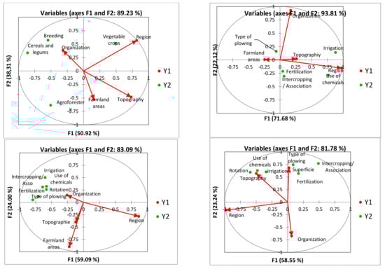 In general, the first two canonical axes account for an estimated 89.23% of the diversity in the characteristic-crop kinds, whereas the first axis accounts for an estimated 50.92%. The choice of crop varieties was considerably influenced by region and organization type, but not by geography or the size of the farmland. The organization and topography arrows in Figure 2’s different directions showed that these two elements had opposing effects on the sorts of crops. Therefore, area and terrain had a significant role in advancing knowledge of the choosing of crop types. As a result, terrain and area played a significant role in promoting a knowledge of crop type selection. Region and organization type were crucial determinants of agroforestry techniques, but topography and agricultural area were not; the first two axes account for an estimated 93.81% of the total. According to estimates, the first canonical axes account for 59.09% of the diversity in the farms’ features and agricultural practices link between vegetable crops, while the first two axes account for 83.09%. The arrows in Figure 2 for region and organizational type pointed in opposite directions, indicating that these two factors had opposing influences on the majority of agricultural practices of vegetable crops. Region and farmland area were significant factors that affected agricultural practices of vegetable crops. The first two canonical axes comprise an estimated 81.78% of the variation in the association between farm characteristics and cereal and legume agricultural methods, with the first axis accounting for an estimated 58.55% of that variation.