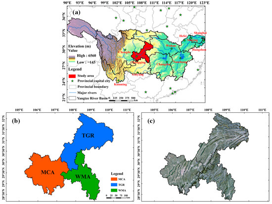Overview of the study region. (a) Its location in the Yangtze River Basin in China; (b) the “one district and two clusters” coordinated development spatial pattern; (c) original remote sensing image. Notes: MCA, the major city metropolitan area; TGR, Three Gorges Reservoir Area town cluster in northeast Chongqing; and WMA, the Wuling Mountain Area town cluster in southeast Chongqing.