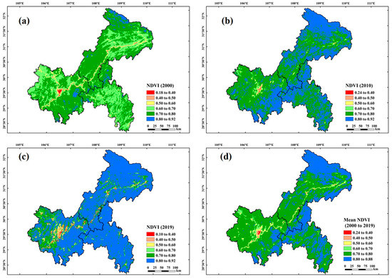 Spatial distribution of vegetation NDVI in Chongqing, China: (a) in 2000, (b) in 2010, (c) in 2019, and (d) for the entire 20-year study period of 2000–2019.