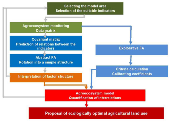 A model is not an exact copy of its original, but only its idealised reproduction that is simpler, more understandable, more accessible and easier, safer and more effective to work with. In the presented study, we used the technique of factor analysis (FA). We used 44 parameters to describe an agroecosystem, which proportionally describe the main components of the study agroecosystem. Based on Malinowsky error analysis, we extracted a 6-factor solution. We found out that Factor 1 [Climate factor] had primary factor loads in [average temperatures TIII-TIX (0.99) and [average atmospheric precipitation ZIII-ZIV (0.99)] variables. Factor 2 [Chemical parameters of geological foundation] was mainly saturated by [SiO2-G (0.92), Al2O3-(0.82), (CaO-G (0.83)] variables and secondary loads were observed in soil [SiO2-P (0.61], [CaO-P (0.64], [Al2O3-P (0.32)], [soil skeleton SKEL (0.47)] and [granularity GRN (0.39)] variables. Factor 3 [Phytomass production potential factor] had primary factor loads in [depth of soil profile DSP (0.76)], [quality of organic substances Q4/6 (0.63)], [slopeness SL (0.67)] and [potential phytomass production PROD (0.65)] variables. In factor 4 [Physical-chemical soil properties factor] variables [Al2O3, (0.81)], [granularity GRN (0.69)] and [SiO2 (0.61)] have significant loads. Factor 5 [Erosion by water potential factor] has the highest primary loads in [large-scale arable land ALL (0.70)] and [soil loss as a result of erosion EROS (0.67)] variables, and secondary loads in the [continuous length of plot of land slope LS (0.53)] variable. Factor 6 [Biochemical properties factor] has the highest factor load values in the content of organic substances in soil [content of organic substances in soil H (0.69)]. Secondary loads can be seen in the properties of soil [GRN (0.35)], [SiO2 (0.32)], [Al2O3-P (0.38)] and [depth of groundwater surface GWS (0.39)]. We determined the weight coefficients for the individual factors with the aim of quantifying ecological criteria with the obtained factor structure. The factor score F0 determines the projections of the extracted factors for the individual elements of the selection (it is the value soil-ecological units—VSEU). Row vectors in this matrix represent the distribution of the individual factors for the specific realisation of the selection (spatial distribution). We re-scaled the obtained values of the factor score into seven categories and projected them into VSEU units. We could propose a sustainable agroecosystem management based on quantifying the ecological criteria for each VSEU unit.