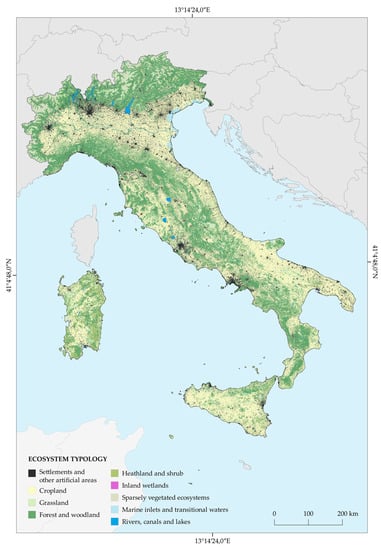 The input data were reclassified according to ecosystems of Table 1 and merged into a single 10 × 10 m raster mosaic. The proposed typologies represent the basic units for ecosystems state and services assessments from the local to national scale. This map aims to provide a representation of the Italian territory with respect to the MAES classes in order to be a useful support for the ecosystem extent accounting activity.