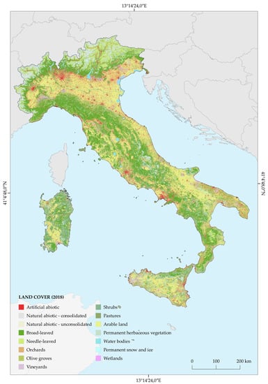 The same input data described before (Table 2) were combined to produce a land cover map for 2018 according to the methodology described in De Fioravante et al. [33].
