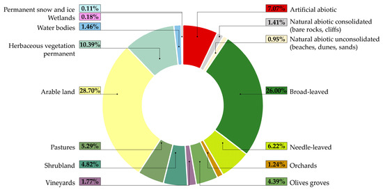 The map refers to the EAGLE compliant classification system of Table 3, while the composition of the land cover (Figure 4) shows a prevalence of forest areas, which occupy approximately one third of the national territory (of which more than 80% consists of broad-leaved trees) and arable land, which covers 30% of the national territory. Permanent herbaceous vegetation and areas with sparse or no vegetation prevail in the high-altitude alpine areas, while olive groves and orchards occupy approximately 5% of the national territory and are particularly present in the south.