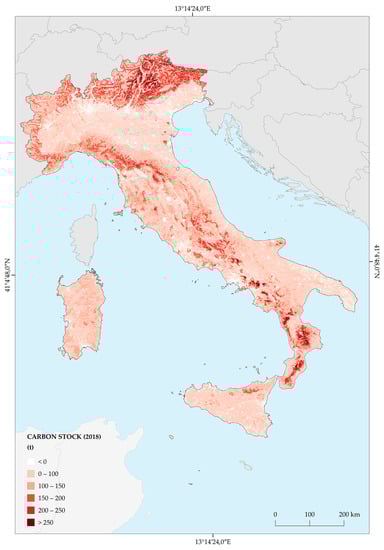 - The soil carbon considers organic and mineral layers up to a thickness of 30 cm. The calculation is based on the 1 km resolution raster produced by CREA-ABP, CNR-Ibimet as part of the Global Soil Partnership/FAO initiative [46], the data of the National Inventory of Forests and Forest Carbon Tanks (INFC) [47], and other data from the literature [33], assuming zero carbon stored by artificial areas.