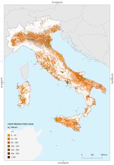 Crop production, understood as an ecosystem service, is the ecological contribution to the growth of cultivated crops that can be harvested and used as raw material [38]. Crop production was calculated using the methodology defined by ISPRA [37,39], based on data from the Italian National Institute of Statistics (ISTAT) agricultural census of 2013 [40]. These data are available at the municipality scale and provide information on the area occupied by the different types of crops (expressed in hectares), and on their total production (expressed in quintals (1 Quintal (q): 1 q = 100 kg; the unit is officially used for data published by ISTAT, although it is not part of the International System of Units)), with reference to both herbaceous and woody crops. Five classes of crops have been identified (arable land, pastures, olive groves, vineyards, and orchards), and for each, the productivity in terms of quintals produced per hectare occupied by the class has been assessed. The productivity value was then traced back to the area of the single pixel (equal to 10 × 10 m) for each province and attributed to all the pixels of that class on the 2018 land cover map. The ecosystem service was calculated starting from the classes in Table 3, obtaining a map with agricultural productivity values per pixel, which were then aggregated with respect to the types of ecosystems. In this way, the agricultural production in 2018 associated with each of the five crops classes for each ecosystem type was evaluated.