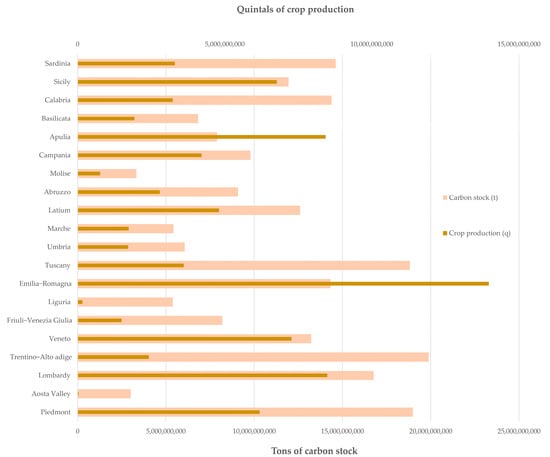 Agricultural productivity varies as a function of the productivity values considered for the different territories; it shows a maximum in the Po Valley and in the hinterland of Naples (Figure 6). The maximum values are relative to Emilia–Romagna, followed by Apulia and Lombardy. Overall, productivity exceeds 10 billion quintals in 6 of the 20 regions (Figure 7).