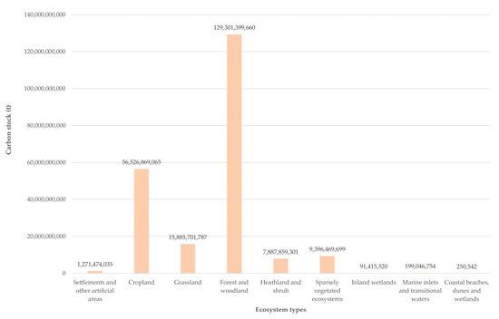 The results of the ecosystem services assessment refer to the single pixel of 10 × 10 m (Figure 5 and Figure 6). Starting with the spatialised data, the values were aggregated with respect to the types of ecosystems, allowing the results that are shown in Figure 8 and Figure 9, which respectively refer to carbon stocks and crop production by ecosystem, both for 2018.