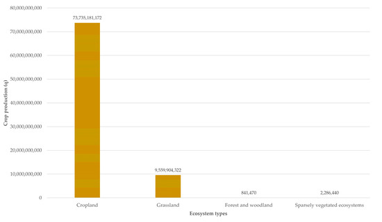 More than 99% of the crop production is concentrated in the “Cropland” and “Grassland” classes, while marginal values can be found in “Forest and woodland” and “Sparsely vegetated ecosystems”.