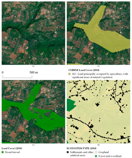 Examples of land cover and land use classes within the types of ecosystems. In the example there is a patch of natural vegetation surrounded by croplands (a). The area is classified as 243 "Land mainly occupied by agriculture, with significant areas of natural vegetation" by CLC (b) and corresponds to the "Cropland" MAES ecosystem typology (d), while in the land cover map the natural woody vegetation component the from the agricultural component (c) has been disambiguated.