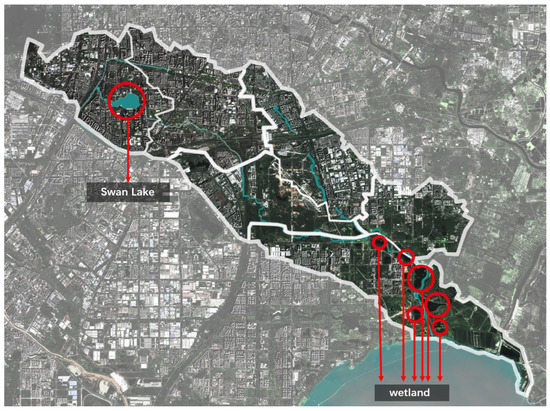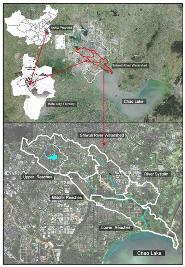 The research case of this study is the Shiwuli River Basin in Hefei, Anhui Province, China. Hefei, the capital of Anhui Province, represents a high-density construction city, with a developed economy. The Shiwuli River Basin is within the urban area of Hefei City, with a drainage area of 111.25 km2 and a total length of approximately 27.2 km. The Shiwuli River Basin in Hefei involves the built area and the area to be built. Originating on the south foot of Dashu Mountain in Hefei, the Shiwuli River flows from west to southeast, passing through Hebaohe District, Shushan District, Hefei, and flowing into Chaohu Lake at Tongxin Bridge. As per the layout of the artificial drainage network in the urban area, the Shiwuli River Basin can be divided into three sub-basins: the upstream, the middle and the downstream. There is Swan Lake, an artificial lake with a capacity of 9.33 million cubic meters, in the upper reaches of the Shiwuli River, with a large area of wetland at the estuary of Chaohu Lake in the lower reaches. The Shiwuli River is one of the main flood-discharge channels in the southwest of Hefei. The river is curved, with the source short, the flow fast and the flood- and dry-water levels changing greatly, where flood and drought disasters occur frequently.