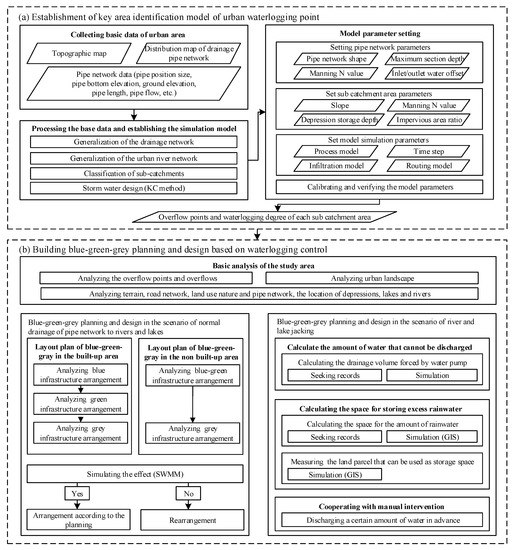 Many aspects as the current research on blue-green-gray infrastructure are covered, there still exist unsolved problems: (1) the city is growing and developing constantly, and only by analyzing the urban hydrological conditions in the future can we deal with the problems that may arise in the future. However, in the case of the simulation on the planning scheme, there exist built-up areas and unbuilt areas in the city. As such, they are not involved in the current research on how to update the blue-green-gray planning in the built-up areas with space constraints along with the unbuilt areas capable of modifying the planning at the same time during the blue-green-gray planning and transformation. (2) The concepts of urban areas are always isolated from watersheds in much of the research about municipal drainage; urban planning represents generally that urban rainwater can be smoothly discharged into rivers and lakes. In previous studies, the blue-green-gray planning rarely considered the situation where urban rainwater cannot be discharged because of the backwater effects of rivers or downstream lakes. Therefore, it is a problem of how to apply the blue-green-gray planning to treat urban rainwater under the scenario of the backwater effects of a lake.