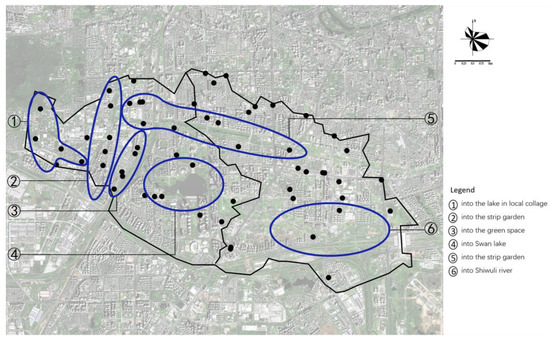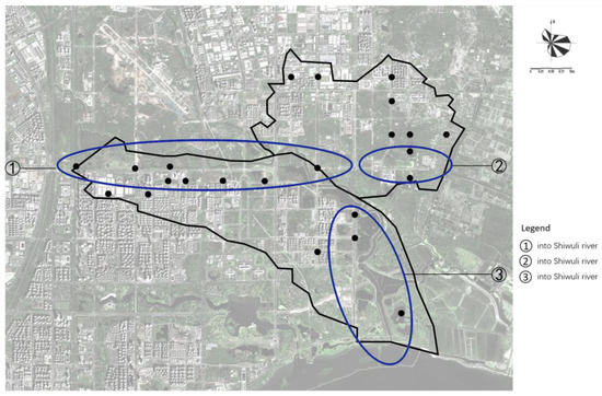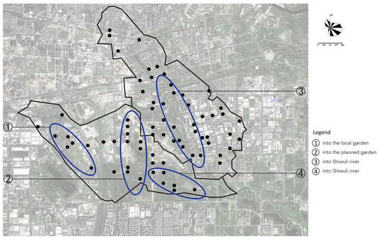 - In this study, the area near the river and lake is directly introduced into the lake by setting blue-green space. If there are roads blocking the area near the river and lake, the road near the river and lake is designed to be the form that rainwater can cross, while the area farther away from the river and lake lacks conditions to make the rainwater in the area overflow from the ground surface into the river and lake. It follows that the rest of the area is planned to be the area dominated by gray infrastructure, such as setting reservoirs or pipe network transformation.