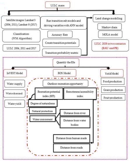 The sources and input data for ES assessment and LULC modelling are presented in Table 1. Moreover, the general structure of the study is indicated in Figure 2.