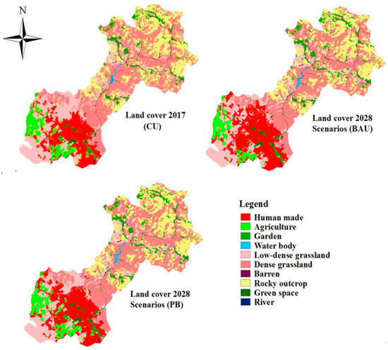 The modelling results indicate that, in the PB and BAU scenarios, 10% and 12% are agricultural and garden lands, and the remaining 76% and 73% are covered by natural land cover and water ecosystems, respectively. However, the spatial distribution of the landscape elements is different for each scenario (Figure 3). Moreover, the findings showed that the most significant LULC change was manifested by urban growth and garden, grassland and agricultural land reduction in the Karaj landscape during 2017–2028 (Table 3).