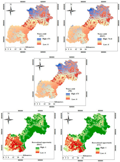 The outputs of the InVEST water yield model were the volume of water yield in the sub-watershed scale and the estimated water yield per pixel. One of the outputs is in the form of a shapefile and a table containing biophysical output values per sub-watershed and the other is in the form of a raster map. In CU and the two scenarios, the ESs were assessed at the sub-watershed scale and the results of the water balance are presented in Table 4. The results show that the average water balance and the amount of available water will be enhanced in all scenarios, since green areas and natural cover transformation (low dense grassland, dense grassland) lead to decreasing evapotranspiration. The increase in water yield due to the reduction in evapotranspiration is not a positive result for water but it signifies the sudden release of water due to the destruction of grassland and gardens, instead of being stored in plant tissue and then being gradually released throughout the year.