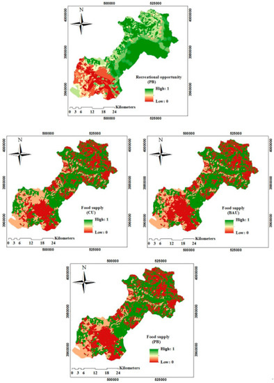 To calculate the present level of ES delivery produced by each LULC class, the viewpoints of thirty scientists were collected from various sectors of governmental institutions (five of these scientists were members of the Iranian Association for Environmental Assessment (http://www.iraneia.ir/en, 24 August 2018)). In this regard, a questionnaire was designed based on the opinions of Burkhard et al. [66,67]. The questionnaire included a matrix specifying the relationship or disaffiliation between each LULC class and food production service. Afterwards, each participant was asked to specify the disaffiliation or relationship between each LULC class and food production by signing ‘Yes’ or ‘No’ in a matrix, to identify the resources producing this ecosystem service. Subsequently, they gave a score for the effective resourcing of food supply in the range of 0 to 5: 0 = no capacity to supply the selected ESs; 1 = very low capacity; 2 = low capacity; 3 = medium capacity; 4 = high capacity and 5 = very high capacity. The scores were averaged and then the values of average capacity were transferred to Arc GIS software to prepare a food production map for current, BAU and PB scenarios for the study landscape.