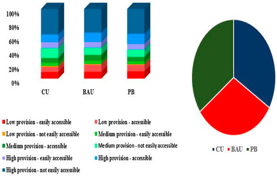 Figure 5 shows the percentage of land within each ROS category. It can be seen that categories 9 (high provision–not easily accessible) and categories 3 (low provision–not easily accessible) are the largest and smallest areas, respectively. From 2017 to 2028, the value of the outdoor recreation opportunity index in the BAU scenario decreased, but in the PB scenario it increased.