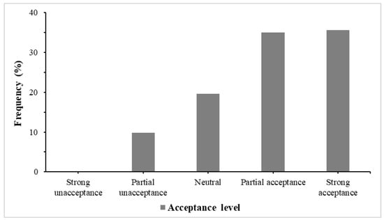 The distribution of the level of residents’ policy acceptance of CLR is shown in Figure 1. The majority of the respondents had a higher degree of policy acceptance (partial acceptance and strong acceptance), while fewer respondents chose neutrality and partial unacceptance. No respondents considered the policy strongly unacceptable. Why did the majority of the respondents have a higher degree of policy acceptance? This may have occurred because the regional ecological environment has been improved through CLR. CLR has also promoted the construction of special rural tourism and idyllic towns. In fact, through CLR, the town has built a country park, which has a positive effect on the local economic development and the level of the residents’ well-being.