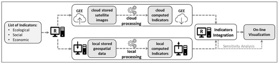 The current prototype is a computer-based platform that integrates the flexibility of R coding with the cloud computing capabilities of Google Earth Engine (Figure 1). In general terms, the platform works based on a set of predefined indicators (including the ecological, social, and economic dimensions), which, depending on their characteristics, are processed on GEE or on a local computer. Currently, all satellite-based indicators are cloud-computed in GEE, whereas the other indicators are computed from geospatial data stored on a local computer. Once all the indicators have been computed and standardized into compatible units, they are integrated through a spatial multi-criteria analysis (SMCA). During the integration process, a sensitivity analysis is performed to help define the weights used in the SMCA. In addition, an optional routine is available to run all the possible combinations of weights as a pre-cached database of results or to build a metamodel. Results are then uploaded to a web-based mapping platform (ArcGis Online) to produce interactive maps (Figure 1).