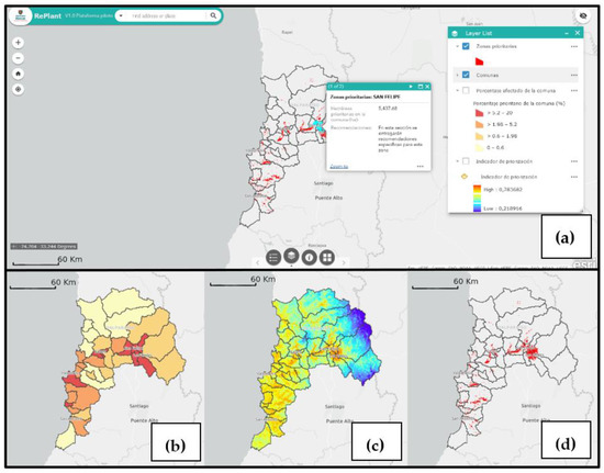General view of the “Replant alpha” platform and the priorization results presented in the ArcGIS web map. (a) The platform where the results to be displayed can be manipulated, (b) Priority percentage of the commune (%), (c) prioritization index (0 to 1) and (d) priority restoration zones representing areas with high restoration priority.