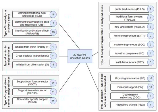 - Type of support—from which sector: Innovation support may have come from within the forestry sector (SECT), from other sectorial support programmes such as agricultural or rural development support (CROSS), or from non-sector specific innovation, start-up or regional development support (NONS). In many cases, multiple support programmes were relevant which is why we find combinations in this and the following categories.