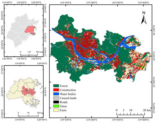 The study area is the central urban area surrounded by Wuhu, Qishan, Lianhua, and Gushan Mountain (Figure 1), which contains Gulou, Jin’an, Taijiang, Mawei, Cangshan, and Changle District, and part of Minhou County (Ganzhe Street, Shangjie, Nanyu, and Nantong Town, etc.), with a total area of 1759.4 km2.