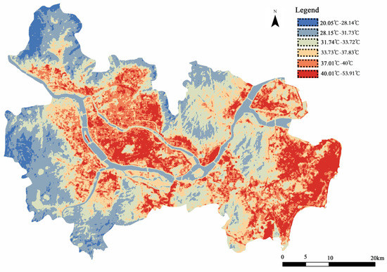 The limited distribution of weather stations leads to limitations in meteorological data, which affects the spatial identification of the risk of a heat wave risk [26]. The inversion of land surface temperature (LST) by remote sensing images can quickly and comprehensively obtain the surface temperature. The UHI effect is most obvious in summer (July–September). On 22 September 2019, a remote sensing map of the study area (downloaded from the website of the US Geological Survey) with a cloud cover of <2% was selected and the surface temperature was inversed by the radiative transfer equation method (atmospheric correction method) with high computational accuracy. The formula is as follows: