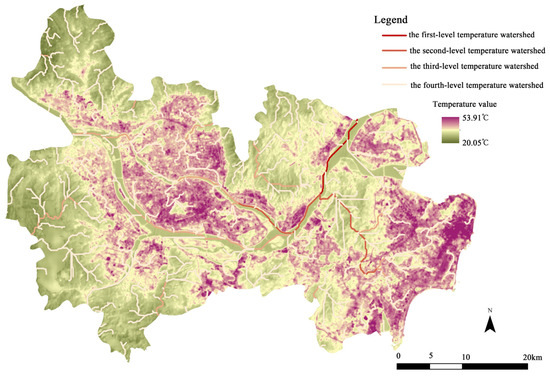 1. The surface temperature inversion map exhibiting the overall spatial distribution of the thermal environment in Fuzhou had a trend of high and low temperatures in the central city and periphery, respectively. The total area of temperature watersheds was obtained using the flow trend of temperature in six districts and one county: Minhou County (353.77 km2), Changle (233.06 km2), Mawei (137.82 km2), Cangshan (71.25 km2), Jin’an (55.99 km2), Gulou (16.93 km2), and Taijiang Districts (15.51 km2). The temperature watersheds were divided into four levels: the first-level temperature watersheds were distributed in the Minjiang River watershed; the second-level temperature watersheds were partly concentrated in the Minjiang and Wulong River watersheds and partly converged in the direction of the Minjiang River–Changle District Marina New Town; and the third- and fourth-level temperature watersheds were only distributed in Mawei and Changle Districts.