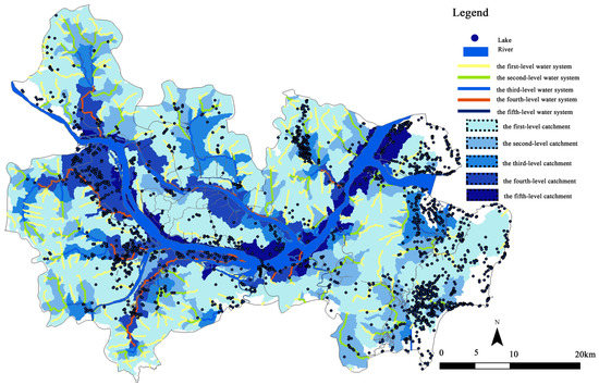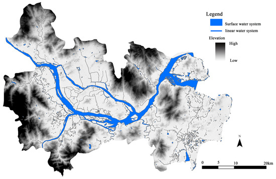 Rivers in Fuzhou can be divided into tidal, plain, and mountain rivers, according to their geomorphological and hydrodynamic characteristics [29], among which tidal (Min and Wulong River) and plain rivers (Jin’an and Baima River, etc.) are perennial. Rivers in mountainous areas are mountain streams, which are influenced by terrain fall and cover many important catchment nodes, including depressions and washes. The water volume of these rivers is usually small and rises sharply during the rainy season, forming mountain rapids with intermittent water storage for a short period of time. The water systems in the study area can be divided into two categories: natural and semi-natural [30]. Natural water systems have existed stably here for a long time and comprise rivers, diversions, ponds, lakes, and reservoirs. Tidal and plain rivers are natural water systems that were extracted using 2.5 m precision Google map in 2019. Mountain rivers are semi-natural water systems in which stormwater runoff and catchment areas were identified and extracted through hydrological analysis models. Rainwater runoff and catchment areas were obtained from 2019 digital elevation model (DEM) data (http://www.gscloud.cn accessed on 20 May 2019) with 30 m resolution in Fuzhou. The method of water system classification is the same as the method of temperature watershed classification, and the pixel assignment method is used. The higher the number of tributaries, the higher the classes of water system. The classification of catchments is divided according to the confluence network of the water system. The bigger the catchment area is, the bigger the corresponding catchments class.